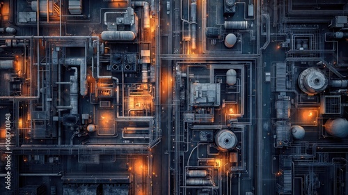 A complex industrial structure with intricate pipelines, tanks, and machinery, illuminated by warm orange lights, creating a detailed, mechanical labyrinth from an aerial perspective