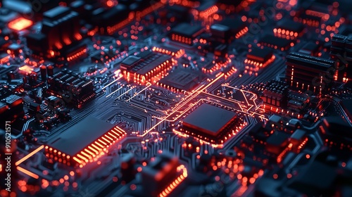 A complex network of electronic pathways on a circuit board connects devices.