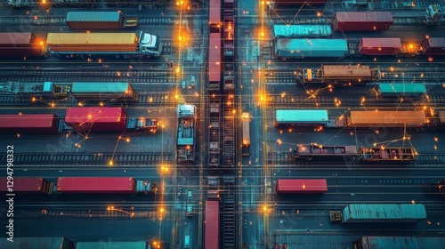 A complex network of interconnected trucks, trains, ships, and airplanes symbolizing supply chains