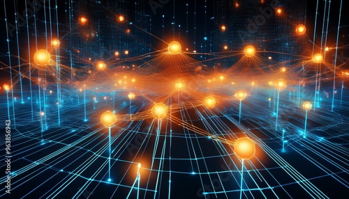 a complex network of orange glowing dots connected by blue lines. The network gives the impression of technology and connectivity, as if depicting an interconnected communication or data system.
