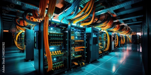 A complex set of wires and cables converge in data center where server process and transmit data around the world. Data infrastructure storage.by Generative AI.