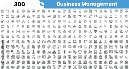 A comprehensive collection of black and white icons related to business management, showcasing various themes like finance, teamwork, and strategy.