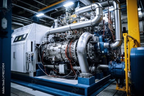 A comprehensive look at an engine test stand amidst the intricate network of machinery and pipework in an industrial setting