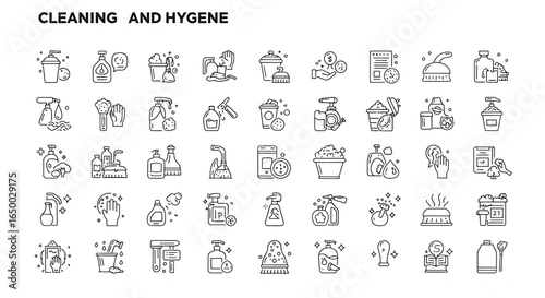 A comprehensive set of black and white line art icons for cleaning and hygiene services products and sanitation concepts.