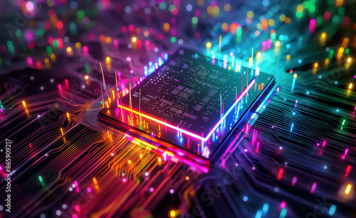 A computer chip emitting colorful light beams and surrounded by vibrant energy.