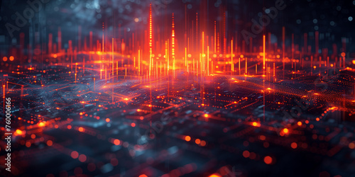 A computer generated image of a city with a red and blue background