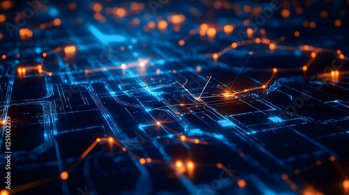 A computer generated image of a city with blue and orange lights. The image is of a cityscape with a lot of lines and dots