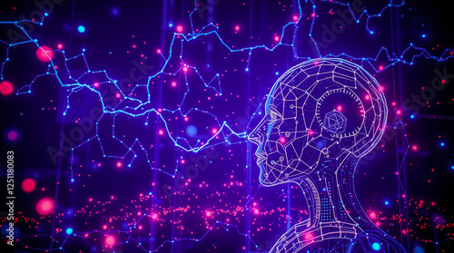 A computer generated image of a head with a face and a body. The head is surrounded by a purple background with a blue and red swirl. The image has a futuristic and technological feel to it