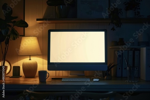 A computer mockup white screen glowing , decor, and a dim light from a lamp on a table in a dark office room