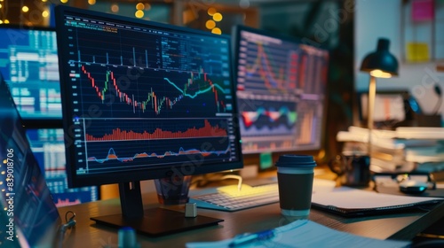 A computer monitor displays a graph of a stock market. A cup of coffee is on the desk next to the monitor