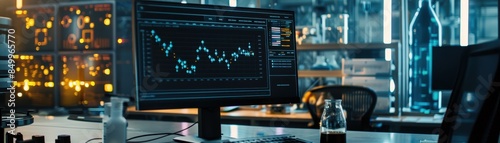 A computer monitor displays a graph of some sort, possibly related to a factory or industrial setting. Concept of technology and progress