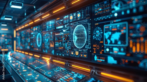 A computer monitor displays a large, glowing sphere. The sphere is surrounded by a network of smaller, glowing dots. The overall effect is one of a futuristic, high-tech environment
