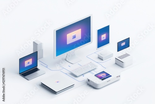 A computer monitor is surrounded by several laptops, tablets, and cell phones
