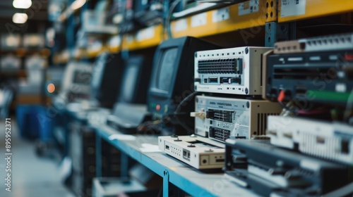 A computer recycling plant where old electronics are disassembled and recycled to recover valuable metals and components.