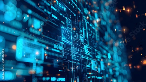 A computer screen with a blue background and a lot of small squares of different colors. The squares are all connected to each other in a web-like pattern. Concept of complexity and interconnectedness