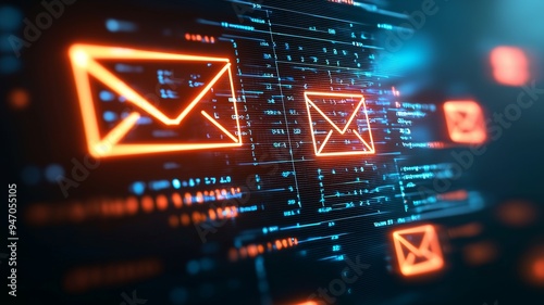 A computer screen with three orange and blue letters that say "emails" on it