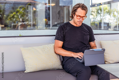 A concentrated man is sitting on a couch working on his tablet, photo with copy space