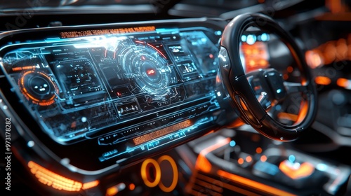 A concept design of a futuristic vehicle dashboard with a glassmorphism effect, showcasing transparent displays and controls