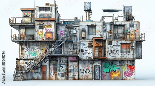 A concept design of two buildings made from scrap metal and concrete, graffiti on the wall, two buildings made from scrap metal and concrete.