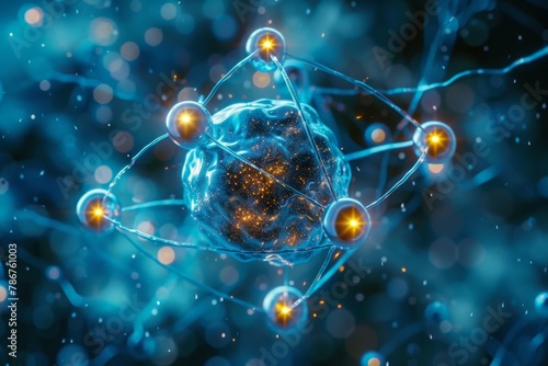 A conceptual digital art featuring a neuron network with connections and energy pulses against a deep blue backdrop