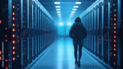 A conceptual image of a data center under siege, with threats looming over servers, depicting the vulnerabilities and risks associated with cyber attacks on data integrity