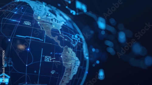 A conceptual image of a digital globe with business icons, perfect for a banner with space for text