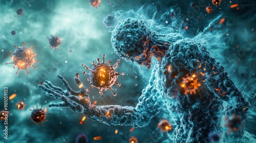 A conceptual image of virus cells multiplying in a human body, with digital effects highlighting infection spread.
