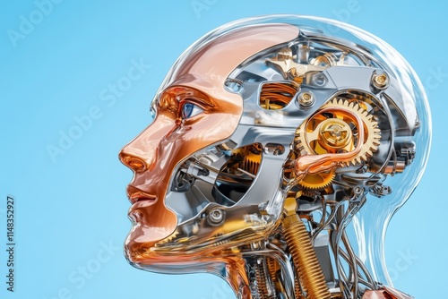 A conceptual photo of a head-shaped clock, with spinning gears and ticking hands visible through its transparent surface