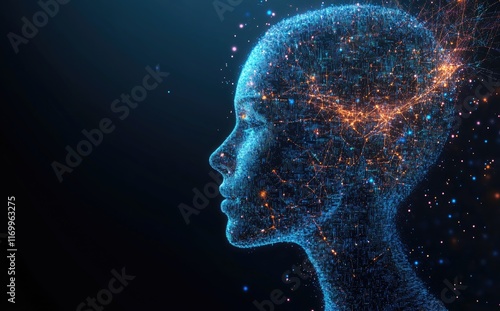 A conceptual side profile of a female head composed of glowing blue and orange digital particles and network-like structures against a dark background. Idea for artificial intelligence, technology