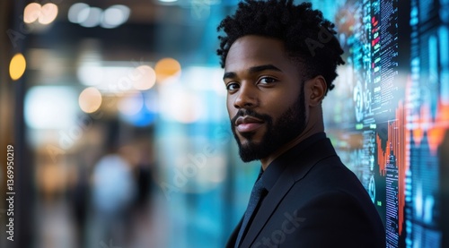A confident Black businessman in a sharp suit poses against a vibrant digital display in a contemporary office setting, exuding professionalism