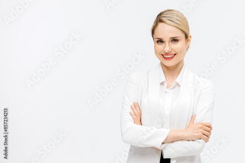 A confident female manager, driven by success, blonde. Portrait of a business woman on a white background. The concept of successful business and career growth.