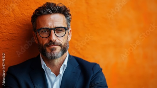 A confident man with glasses and a beard poses against an orange wall, wearing a stylish blue suit that complements his calm expression and composed demeanor.