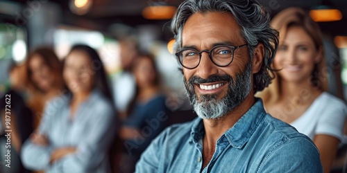 A confident man with glasses and a beard, smiling warmly in a professional environment with blurred colleagues standing in the background