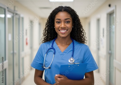A confident nurse smiles while holding a clipboard in a hospital hallway