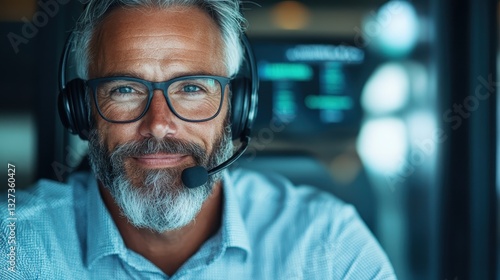A confident older man with a headset and glasses smiles warmly, embodying professionalism and approachability in a modern, tech-savvy environment focused on communication.