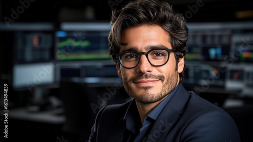 A confident professional man with glasses smiles in front of multiple computer screens displaying financial data, perfect for business, finance, or investment-related projects,