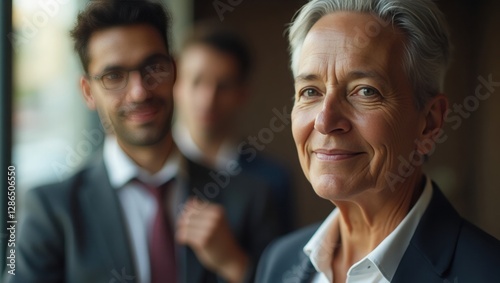 A confident woman smiles, exuding professionalism, while a man stands in the background adjusting his tie. The atmosphere reflects a vibrant networking event during late afternoon