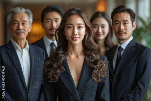 A confident woman stands at forefront of professional group, showcasing leadership and teamwork. diverse individuals behind her reflect strong sense of unity and collaboration