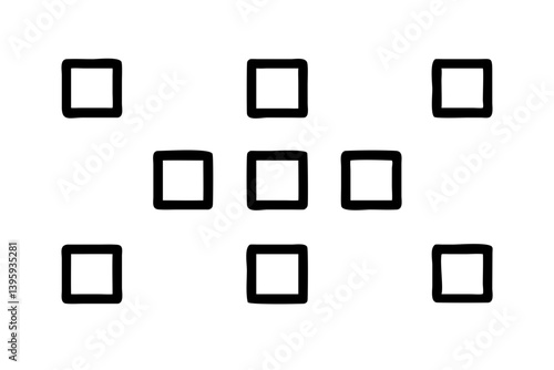 A constellation of bold, black squares scattered across a stark white background, creating a simple yet striking visual pattern.
