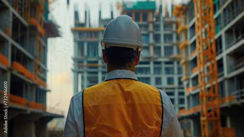 A construction engineer standing on a building site wearing a protective helmet and uniform. Rear view looking at a building under construction.