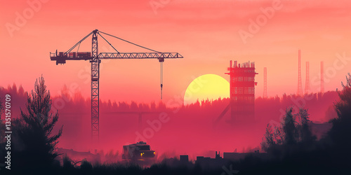 A Construction Scene at Sunrise Featuring a Mobile Crane Lifting Heavy Materials for an Expanding Urban Development Project