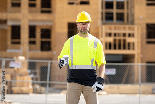 A construction worker at a construction site drinks coffee during a break. builder man in a helmet and vest holding a glass of coffee. a construction inspector in a helmet drinking coffee.