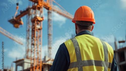A construction worker directing crane operations at a building site, with a focus on safety signals and machinery, looking at the camera