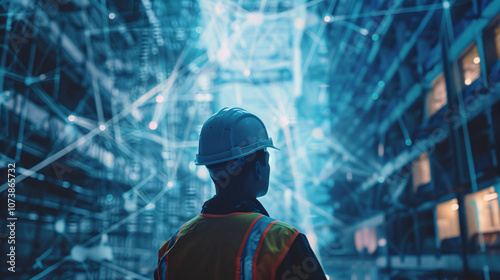 A Construction Worker in a Hard Hat and Safety Vest Observes the High-Rise Building Structure Illuminated by Digital Projections, Highlighting the Merging of Technology and Construction in the Evening