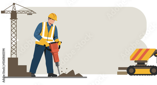 A construction worker in a hard hat operates a jackhammer near a crane and excavator, suitable for a landing page or marketing banner with flat design elements.
