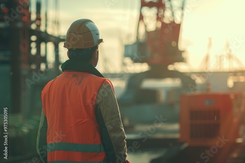 A construction worker in a helmet and vest observes equipment at a busy construction site during daytime hours