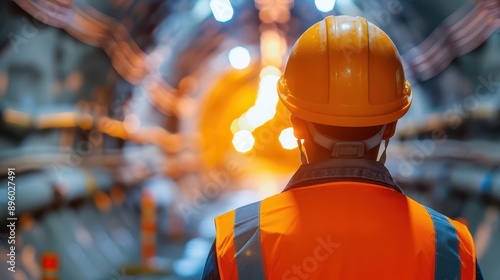 A construction worker in a safety helmet observes a tunnel with bright illumination, showcasing industrial work and safety.