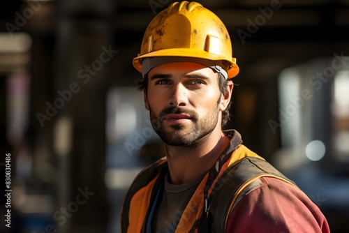 A construction worker in a yellow hard hat and orange safety vest stands in an industrial setting with a focused expression