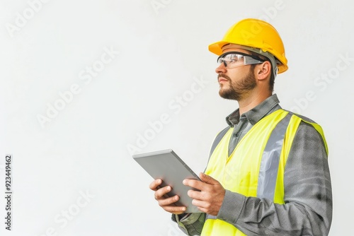 A construction worker in a yellow safety hat and vest using a tablet, signifying efficiency and modernized workflows in construction environments with a professional focus.