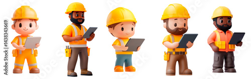 A construction worker in a yellow uniform and hard hat, holding a tablet isolated on transparent background